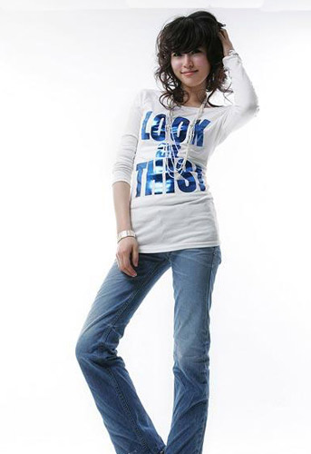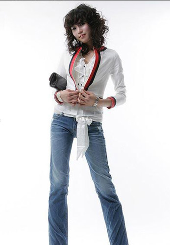点评:长款紧身T恤有拉伸视线的效果,配上简单的直筒仔裤,修身的裤型加入一些褶皱的元素,搭配长串的珠链,简洁时尚。