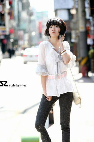 点评:纱质面料的白色上衣,隐约的透视带来朦胧的性感,领口的褶皱和袖口的花边女人味十足,束上宽腰带,给这种小女人情怀增加一些别致和硬朗,小坤包一拎,诱惑倍增。
