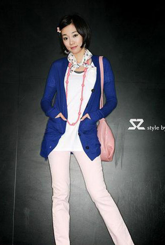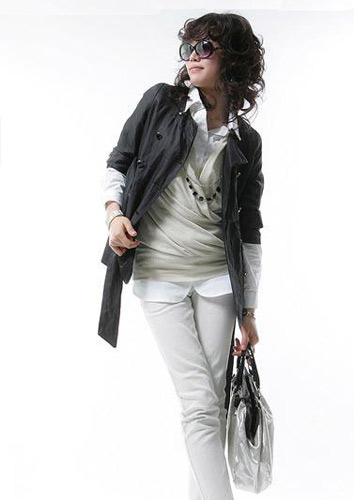 点评:简洁的白裤有视觉上纯净感,搭配普通的浅色T恤,只要再套上一件深色的修身短款小西装,立刻显得帅气十足。