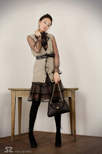 点评:集所有凸显女人味的元素于一身的裙装,蕾丝、半透明黑纱、蝴蝶结、荷叶边、塔裙,为了不使所有这些元素搭配在一起显得过于凌乱,一件中性针织长马甲起到了很好的收敛作用,适当的增添了知性的味道,而系的很高的蝴蝶结腰带是对裙子的呼应,在视觉上也起到了拉伸腿长的效果。