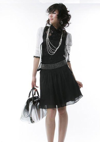 点评:黑色的纱裙延续了公主裙的华丽感,神秘的黑色增添了成熟女人的诱惑,搭配白色小衫和挂饰使整体明亮起来,同时更增加了成熟优雅的气质。