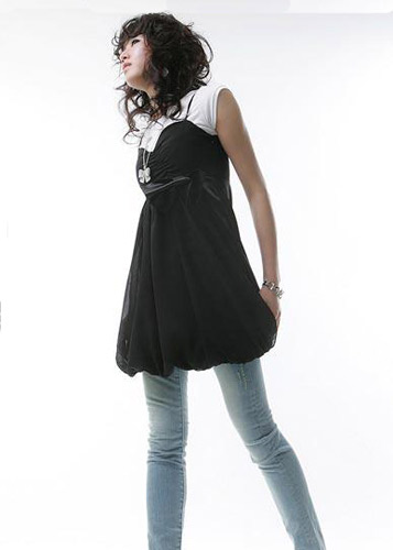 点评:韩式的泡泡裙甜美可爱,黑色的的吊带款式融入了一点儿小性感,搭配白色T恤和贴身牛仔裤自然随意感强烈,裙子的泡泡设计有效的遮掩了腰部和大腿的赘肉。