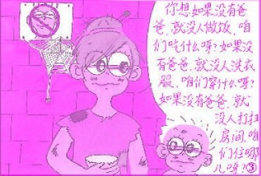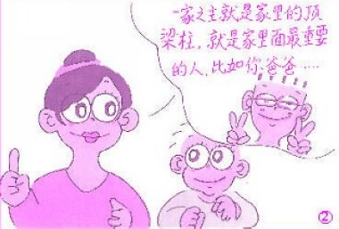 桐宝的亲子共读时光最早可上溯到他出生前,当他还在肚子里,桐妈就开始坚持每天为他读书了。桐宝出生后,亲子共读的习惯也延续了下来。起初,桐宝只是个安静的听众,后来,他学会了说话,便“不甘寂寞”起来,时常会发表些评论或提点儿问题。一天,桐妈为桐宝读故事:“兔爸爸是一家之主……”听到这儿,桐宝不明白了:“什么叫一家之主啊?” “一家之主就是家里的顶梁柱、最重要的人,”怕不够清楚,桐妈举例说明,“比如爸爸,你想如果没有爸爸,就没人做饭,咱们吃什么呀?就没人洗衣服,咱们穿什么呀?就没人打扫房间,咱们住哪儿呀?”
