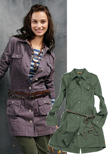 编辑意见:中性风潮流行的同时,帅气的军装风格服装也开始走红,而长款的风衣外套有很好的修身效果。军装式的设计兼具了休闲与帅气的特色,能把你衬托得更具时尚感。腰间加一条细细的皮带或绳结更找回一些女人味,使整体风格不会太像男人。