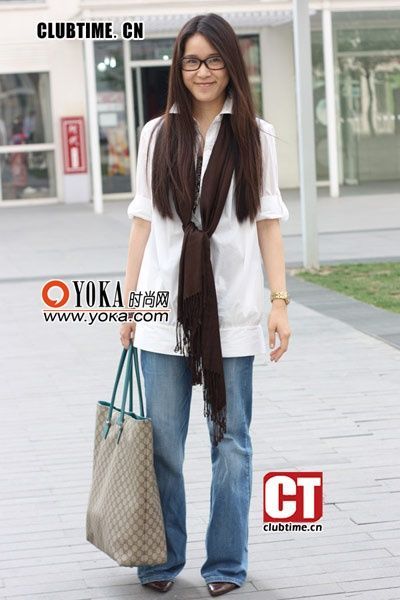 宽松白衬衫牛仔裤,咖啡色围巾和尖头鞋调配颜色更显瘦。