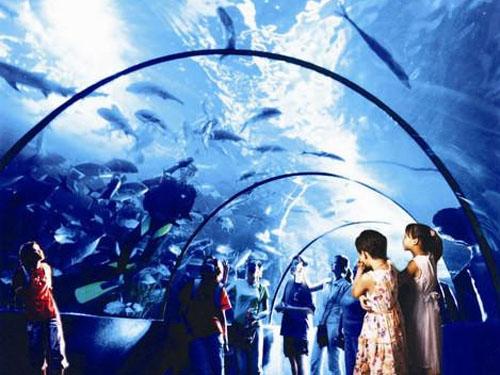 当走出海洋馆触摸池后,眼前豁然开朗,超大弧形亚克力胶展示窗撩起大海神秘的面纱,海底隧道好像如歌的行板,轻柔平缓地带入静谧而瑰丽的海洋世界。32个展示缸,展示着地球上最富典型性、代表性海域的观赏鱼类,它们给游人讲述着一个又一个动人的海的故事。不用走出京城,就可以经历一次奇妙的环球海底旅行。