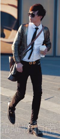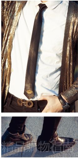 真正的时尚是在细节中体现出来的,像这位帅哥这样在重视整体搭配效果的同时,仍不忘以金色配饰呼应整体装扮,就连领带上也绣着一枚金色皇冠。
