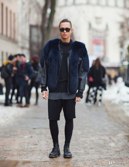 蓝色皮草拼接款皮衣搭配黑灰色系短打装扮,潮范儿十足!黑灰色系打底衫搭配黑色短裤以及leggings,层次感强烈的标准范儿闷骚男装扮。