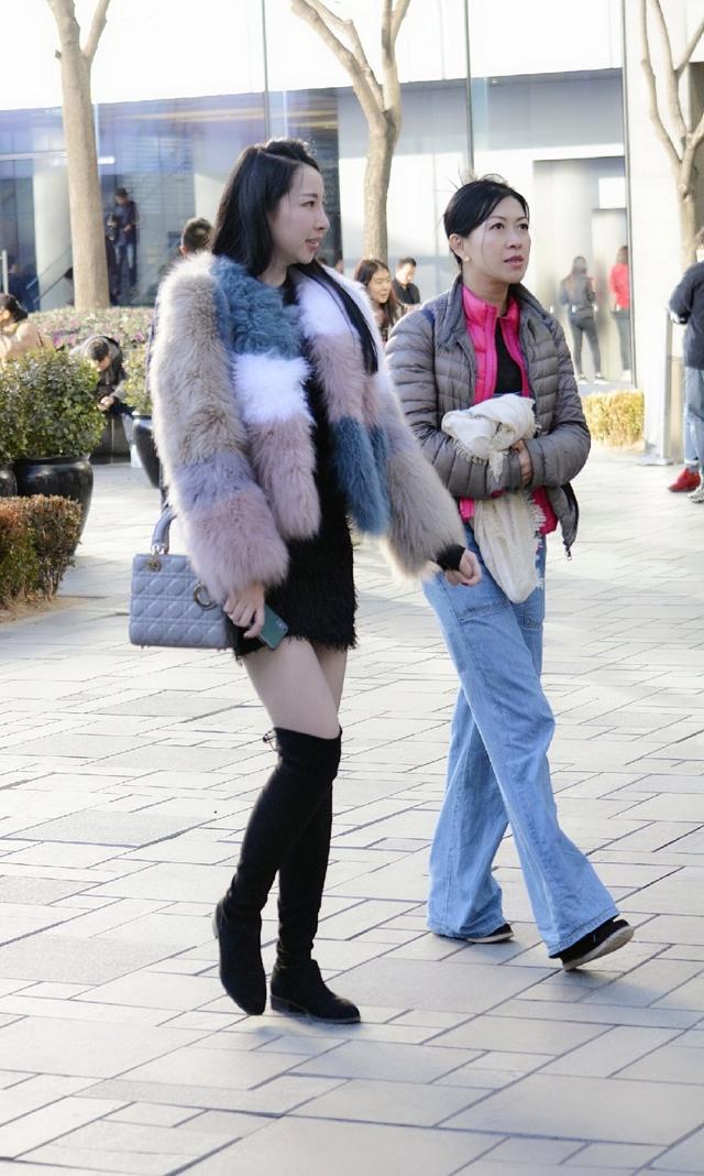 这位小姐姐穿着黑色平底过膝靴,显露出了小姐姐漂亮的腿部线条,黑色毛毛的瘦身连衣内衬,外搭一款三色相拼接的皮草短款外衣,尽显女人穿衣品味,走在时尚街区美丽又吸睛。