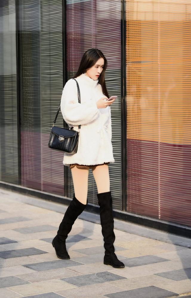 白色羊羔绒中长款上衣,系带的设计时尚又显腰部线条,肉色裤袜搭配黑色过膝靴,美丽动人又优雅女人。小姐姐背着黑色包包,时尚又淑女的衣装搭配,看上去真的好美。有木有? 转载自百家号作者:美女与时尚