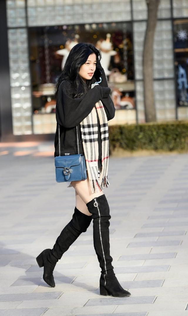 这位女孩选择黑色拉链中粗跟过膝靴,搭配黑色卫衣,青春活力又可爱减龄。蓝色肩包和格纹围巾的搭配,休闲随性又有小女人味。 转载自百家号作者:美女与时尚