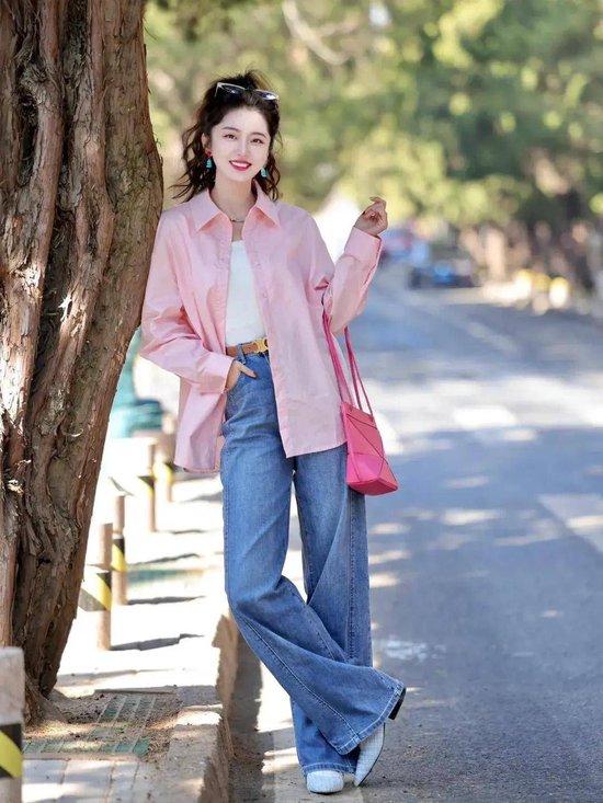 一件粉色的衬衫上衣+白色T恤,下半身选择蓝色牛仔裤组合搭配,加上踩着一双粗跟鞋,简约大气,这位时尚博主是一位辣妈,但是完全看不出她的真实年龄,显得少女感爆棚,活力四射,超漂亮。