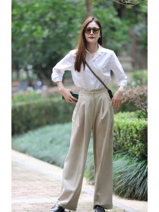 高腰收腰版型设计的阔腿裤我还蛮建议多尝试的,能提升腰线又能勒出小蛮腰,适合小个子女生借鉴穿搭,就算是大骨架的女生,下面这位博主的穿搭示范也很值得借鉴,上衣是经典版型的白色衬衫,遮肉显瘦。