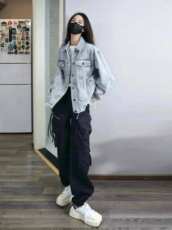 达人用一件浅蓝色的牛仔外套和黑色工装裤组合搭配,这样的穿搭造型确实很酷。