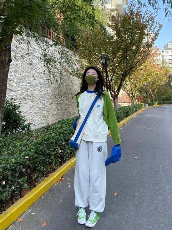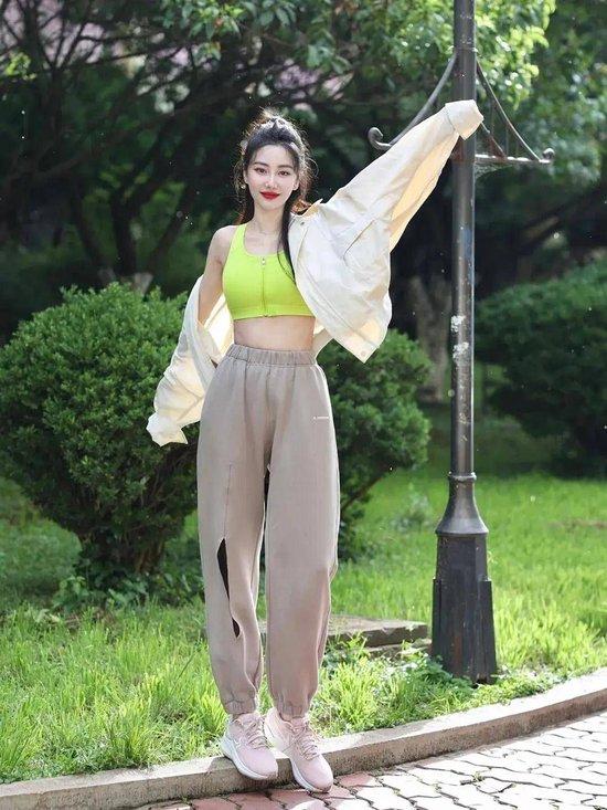 杏色的运动外套,内搭绿色的短背心,秀出你的马甲线,下半身是一条个性十足的运动鞋和运动鞋,这样的打扮造型像不年轻美貌都很难,直接“少女感”拉满~