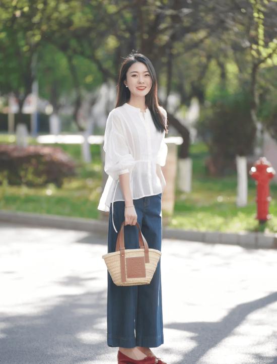 如果下面这位博主用一件小众版型的白色衬衫和蓝色牛仔直筒裤搭配,通勤时髦,穿搭去上班、逛街、约会都是一个很不错的选择,而且不挑人,普通大众穿搭了都很fashion~