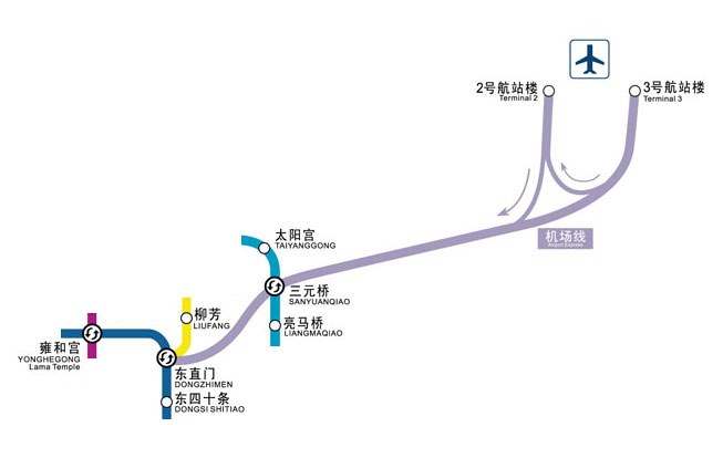 北京机场地铁(北京机场快轨)途径车站: 东直门 - 三元桥 - T3航站楼 - T2航站楼(共4站)