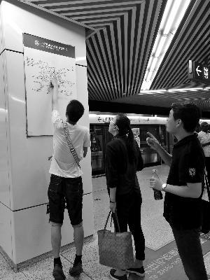 记者又走访其他地铁站,在海淀黄庄站看到,同样的“北京城市轨道交通线网图”被贴在了不锈钢宣传栏里,看起来正合适。