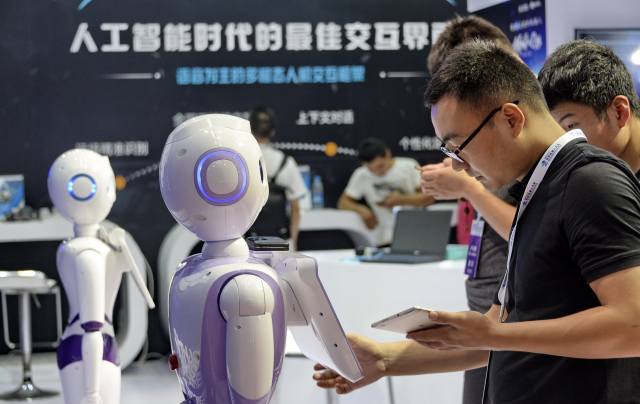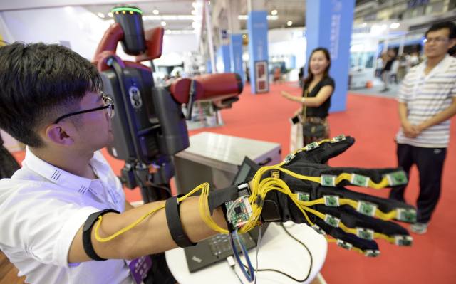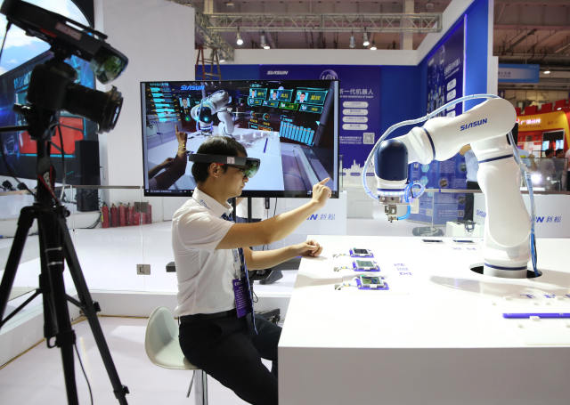 8月22日,在北京亦创国际会展中心,工作人员在演示人机协同作业系统。新华社记者金立旺摄
