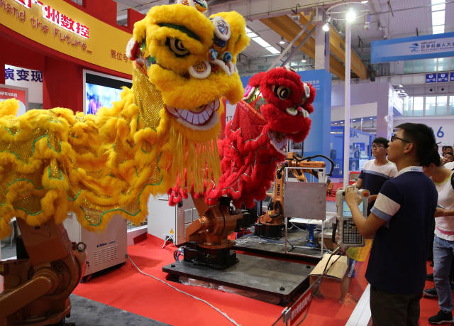 在北京亦创国际会展中心展出的舞狮机器人(8月22日摄)。新华社记者 金立旺 摄