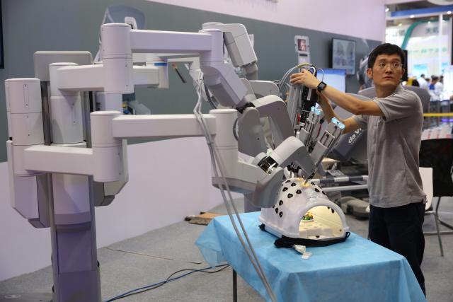 8月22日,在北京亦创国际会展中心,工作人员在调试机器人外科手术系统。新华社记者 金立旺 摄