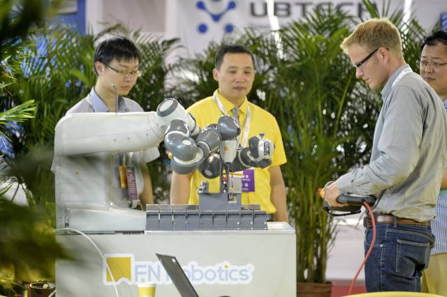 8月22日,在北京亦创国际会展中心,工作人员演示7自由度协作机器人。新华社记者 金立旺 摄