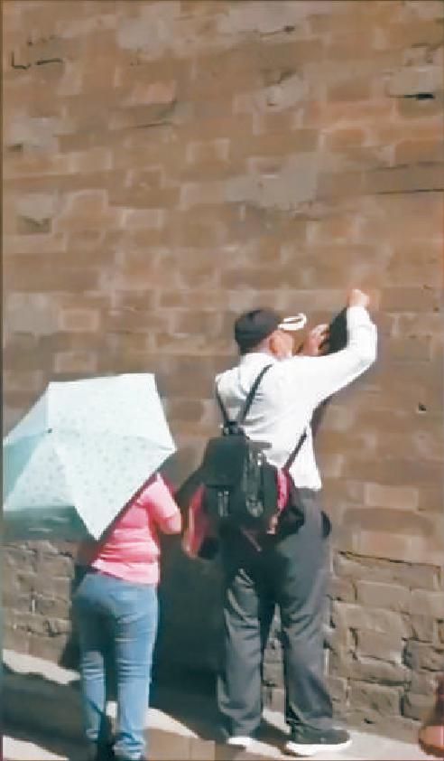 9月21日,有北京市民发现,在故宫西华门城墙前,一名身穿白衣黑裤、头戴棒球帽的男子正拿着车钥匙用力在城墙砖上刻画!这一行为令目击市民十分气愤,他上前厉声制止:“知不知道这是文物啊!”受到指责后,白衣男子的同行者连忙道歉。目击市民随即将这一情况反映给了故宫工作人员。此事在网络上曝光后迅速引发热议。有网友直言“手这么欠,一声道歉就完了?应该进黑名单!”