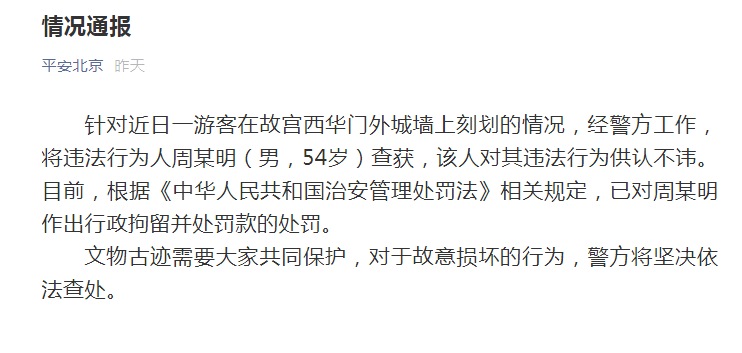 针对近日一游客在故宫西华门外城墙上刻划的情况,经警方工作,将违法行为人周某明(男,54岁)查获,该人对其违法行为供认不讳。目前,根据《中华人民共和国治安管理处罚法》相关规定,已对周某明作出行政拘留并处罚款的处罚。