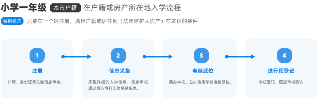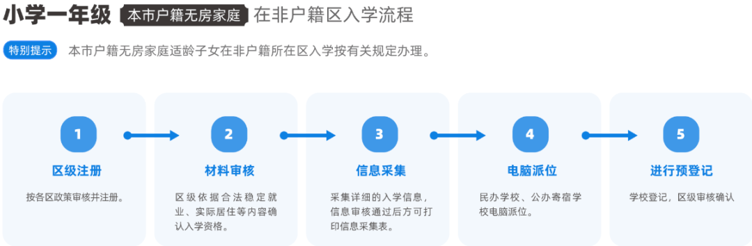 本市户籍在户籍或房产所在地入学、本市户籍无房家庭在非户籍区入学、非本市户籍入学等不同人群的入学流程如下: