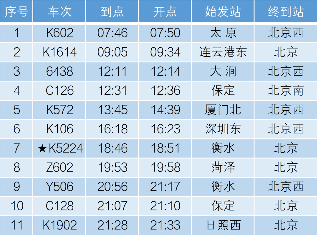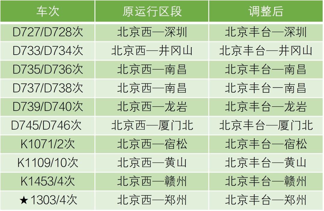 北京丰台站开通运营后,部分北京站、北京西站始发列车调整了始发车站,具体车次如下: