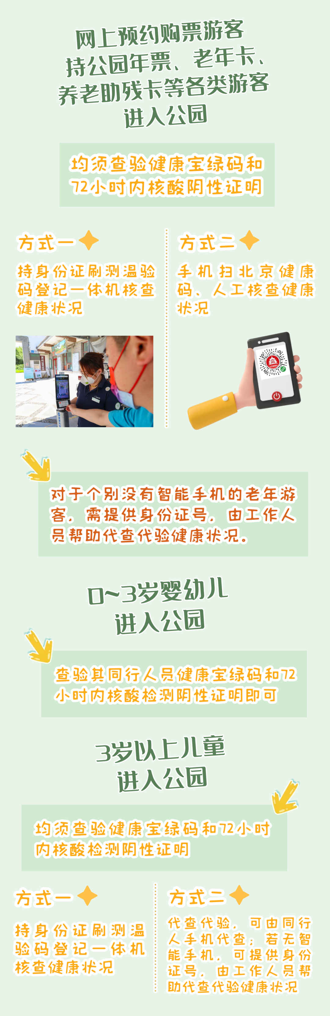 为保障大家安全便捷游园,进入市属公园、中国园林博物馆和国家植物园游览参观时,须按规定测量体温、查验健康宝绿码和72小时内核酸检测阴性证明。为了便捷大家入园游览,请收好这份在门区验码查核酸方法的小贴士吧!