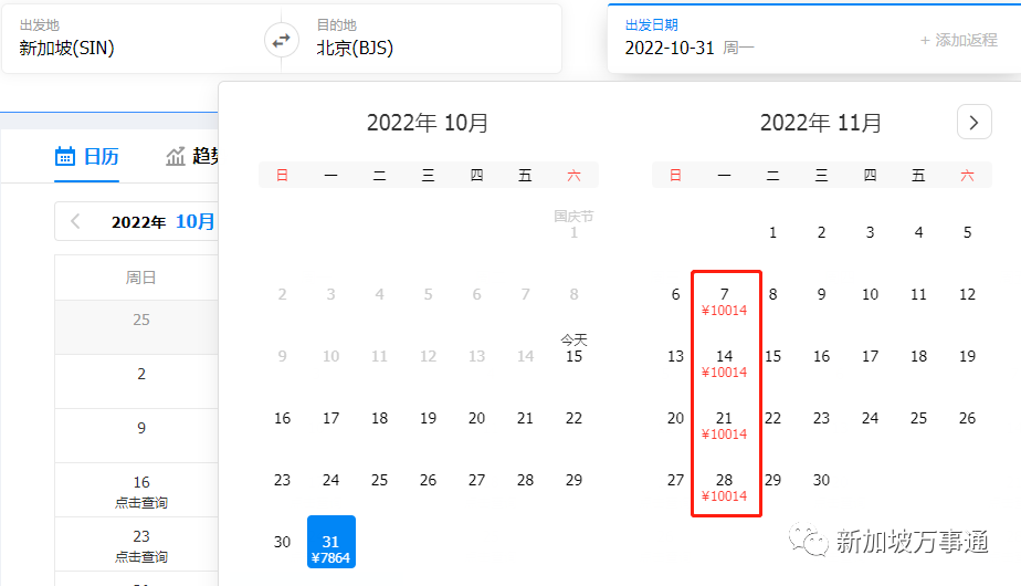 除了第一天的低价优惠,11月份和12月份的从新加坡飞北京航班的航班价格也很稳定,价格是10014元人民币!