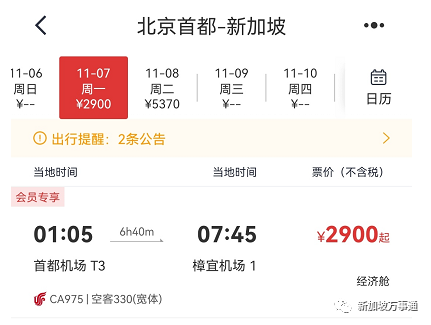 另外,万事通也查询了从北京直飞新加坡国航的机票价格是2900元人民币,有北京去新加坡探亲的小伙伴可参考哦~