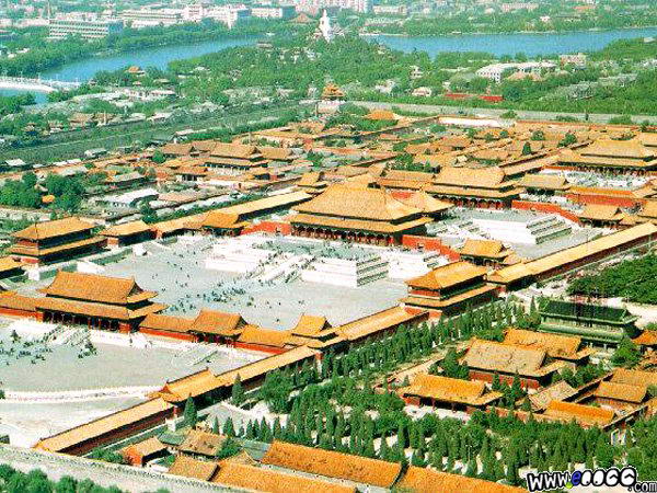 是明、清两朝的皇宫,俗名故宫,又叫紫禁城,现名故宫博物院。先后有24个皇帝在这里统治全国。占地面积72万平方米。故宫有高墙环绕,城外还有宽52米的护城河(又名筒子河)。高耸的宫墙里面,有各式宫室8704间,建筑面积15.5万平方米。城四方都有高大的城门楼。南面正门叫午门,北面名神武门,东边称东华门,西边为西华门。城的四角各有一座秀丽的角楼。整个建筑群按中轴线对称布局,层次分明,主体突出,按其布局可分外朝、内廷两大部分。外朝以太和、中和、保和三大殿为中心,文华、武英殿为两翼,是皇帝举行各种典礼和从事政治活动的场所。内延以乾清宫、交秦殿、坤宁宫为主体,另有养心殿、御花园、外东路及外西路等,是皇帝处理日常政务和居住之处。外朝建筑雄伟壮观,气势磅礴;内廷建筑金碧辉煌,布局严谨。