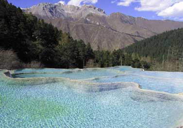 岷山主峰雪宝顶海拔5588米,从顶峰流下的雪水汇聚成溪,沿石钟乳山坡倾泻而下,跌宕起伏,形成众多的瀑布悬流,这些瀑布泻落至山腰处,便散落聚积,从而在黄龙沟内形成了3000余个碧透斑澜的彩池,大者千余平方米,小者仅几平方米,千姿万态。池水清净,深浅不一,有的地方色彩鲜艳,仿佛彩锦。这一奇特壮观的梯状彩池群,正象人间想象中的瑶池仙境一般。