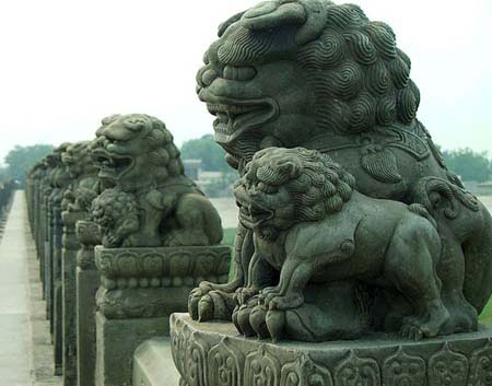 卢沟醒狮 —— 北京西南的永定河上,有座现存最古老、最长的联拱大石桥,始建于金大定29年(1189年),全长266.5米,桥宽7.5米,11孔,桥面两侧护栏各有140根望柱柱上共雕有形态各异的石狮子485个,活泼可爱,栩栩如生。该桥规模之大、造型之美、质量之高,堪称国内古桥之冠,然而,卢沟桥的出名远不止因为如此,昔日卢沟晓月,见证了当年日本帝国主义侵华铁蹄的践踏,也目睹了中华儿女反抗侵略的壮举,七七事变成为永远的纪念。经历了沧桑风雨,如今古桥依旧,风采依然。