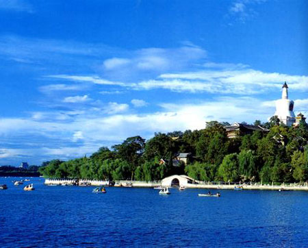 白塔堆云 —— 北海是北京城内最大的皇家御苑,历辽、金、元、明、清五代,为世界罕见。北海由湖面和琼华岛组成,水面占去一半有余。岛上白塔是古都北京的标志性建筑,造型优美,矗立岛上,倒影映在水面之上,波光粼粼中塔影如画,衬着白云丽日,让人心旷神怡。