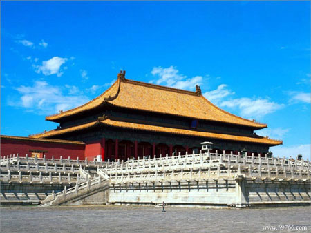 紫禁城占地72万平方米,周围环有10米高的城墙和52米宽的护城河,四端有巍然耸立的角楼。紫禁城有房8700多间,太和、中和、保和三大殿坐落在南北中轴线上,两旁分布着文华、武英殿。后宫以乾清宫、交泰殿、坤宁宫及东、西六宫为中心,并以宁寿宫与慈宁宫为两翼构成内廷。站在景山万春亭上望远眺夕阳下的故宫,紫禁城重檐如山,气势非凡。