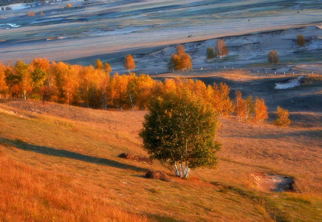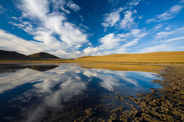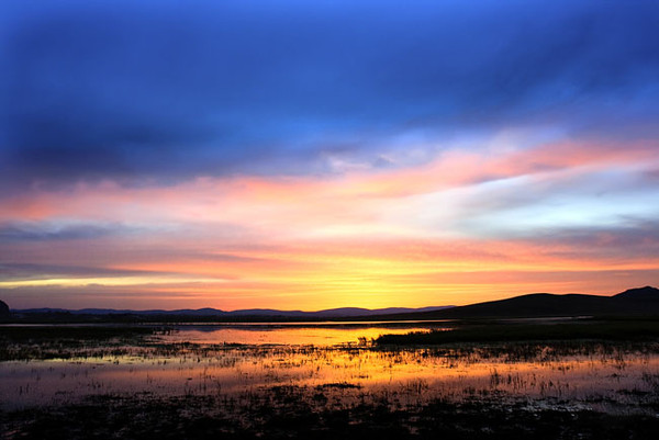这里的水面开阔,四面环山,拍晚霞照片的最佳地点,水中的芦苇长得一丛丛的,而且还错落有致,好像是给摄影师安排的道具,每天下六点多钟时,会有一大群马飞奔到湖边来喝水,群马入水,溅起的水花非常漂亮。