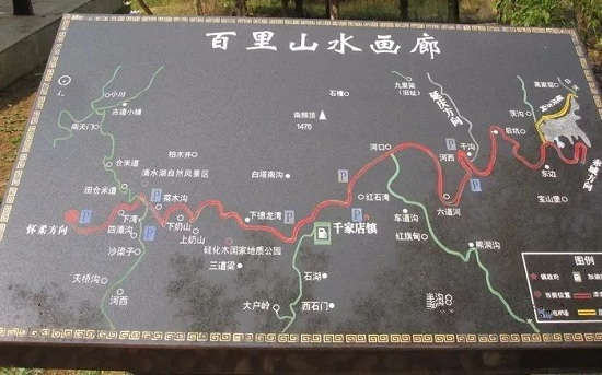 百里山水画廊可以根据地图分成上下两道,上道以寺庙人文景观为主,从西边出发,千家店镇牌楼处左转,一路向北向东,过花盆村,直到乌龙峡谷、滴水壶。