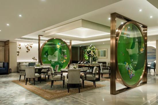 走入大堂,更是一座京味儿博物馆,梁国辉创作的缟玛瑙手雕“影壁”映入眼帘,刻着竹 、莲、兰、梅代表四季吉祥的花卉植物,艺术家秦风5米高的水墨画在钴蓝色的背景上呈现出了日月,从骨子里演绎着京城的绝代风华。