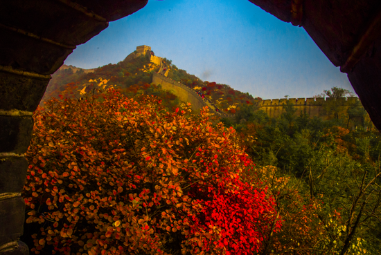 红叶辉映残长城,如娇媚美人偎依沧桑英雄,构成一幅雄浑大气的壮观景象。穿行于红叶林中,震撼人心,带来一种别样的风情。