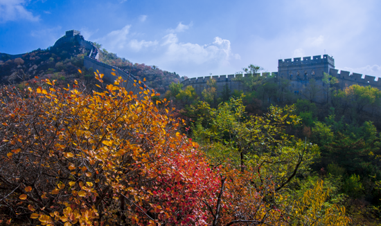 浓郁的秋色染遍水关长城,红色、黄色、绿色交织在一起,好像巨大的调色板,构成一幅美艳绝伦的秋之画卷。