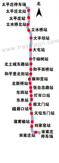 北起昌平区的太平庄,南至丰台区宋家庄,途径太平庄北站、太平庄站、立水桥北站、立水桥站、大羊坊站、大屯站、干杨树站、北土城东路站、和平西桥站、和平里北街站、雍和宫站、北新桥站、张自忠路站、东四站、灯市口站、东单站、崇文门站、磁器口站、天坛东门站、蒲黄榆站、刘家窑站、宋家庄站。